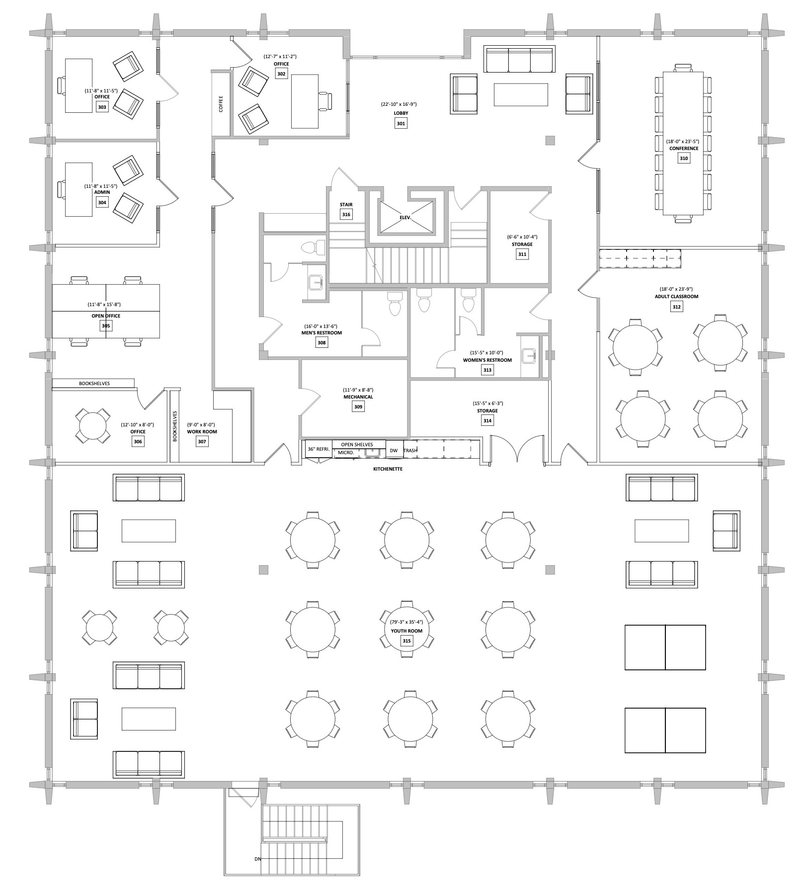 The drawings below depict a preliminary conceptual design of a renovated space.